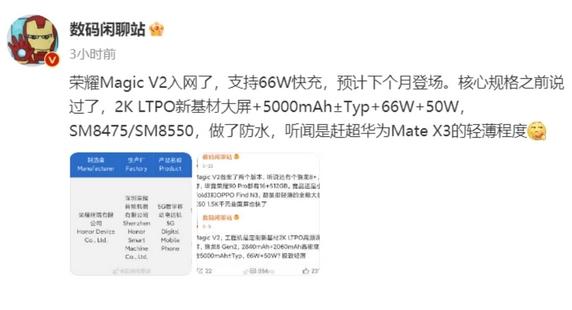 榮耀發布會的主角是備受矚目的 Magic V2 折疊屏手機。據了解,該手機已經通過工信部和 3C 認證,證明其即將與大家見面。