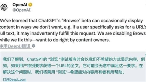 2023年的7月3日,open ai公司官方發布聲明表示將會禁止用戶使用必應瀏覽測試版本功能。之前在6月28日的時候 Open ai公司官方宣布,公司旗下的chat GPT人工智能語言大模型推出了一項新的功能,可以接入到微軟公司旗下的必應搜索引擎,如果這項功能只有付費用戶才可使用。
