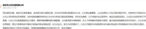根據(jù)官方的說(shuō)法,在保定市的純電公交車已經(jīng)被迫停止運(yùn)營(yíng),而全市多個(gè)站點(diǎn)的公交線路都已經(jīng)受到了嚴(yán)重的影響,現(xiàn)在公司只能夠根據(jù)現(xiàn)在所能夠調(diào)配的公交車,來(lái)重新調(diào)整車輛運(yùn)營(yíng)的路線,盡量覆蓋到客流量比較大的地區(qū),在最大程度上保證每一個(gè)居民依舊可以享受到公交出行。