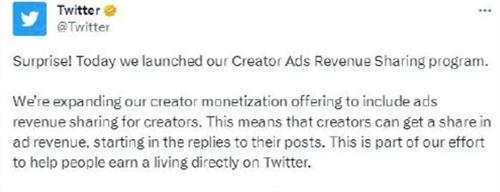 推特平臺官方表示,此次的創作者廣告收入分享計劃主要面向的群體是日常生活主要來源都依靠于推特平臺的用戶群體,在之前平臺中就已經正式推出了創作者付費訂閱的服務,也就相當于中國市場中的內容付費。在官方消息正式公布以后,已經有一批創作者開始在平臺內分享自己已經獲得廣告收入分享的截圖。