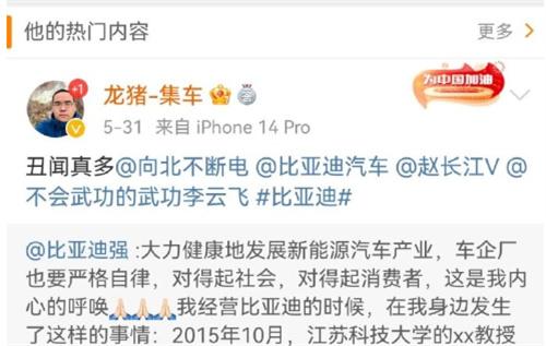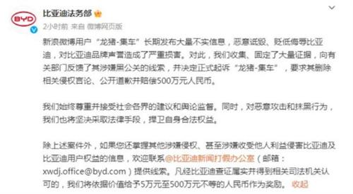 在北京時間2023年7月24日,比亞迪汽車公司旗下的法務部在微博平臺中的官方賬號發布了第1條微博表示,在新的微博平臺中名為龍豬-集車的用戶在歷史動態中長期發布,有關于損害比亞迪汽車公司聲譽的相關內容,對于品牌已經造成了嚴重的影響,現在比亞迪汽車官方已經收集了大量的證據向有關部門反饋。比亞迪公司目前決定起訴龍豬-集車微博用戶,要求該名用戶刪除和比亞迪汽車有關的所有言論,而且要在社交平臺中向比亞迪汽車官方公開道歉賠償公司500萬元人民幣。