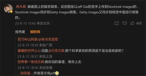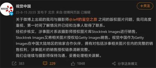 在2023年8月15日有一名名為Jeff 的星空之旅的科普博主在微博平臺中發文表示視覺中國向自己撥打電話,要求向視覺中國支付照片侵權費大概8萬元人民幣,視覺中國表示該名博主一共有173張照片涉嫌侵權。博主回應稱這些照片都是自己親自拍攝而成,自己從來沒有和視覺中國達成過任何的合作,博主要求視覺中國必須要對這件事情作出合理的解釋。
