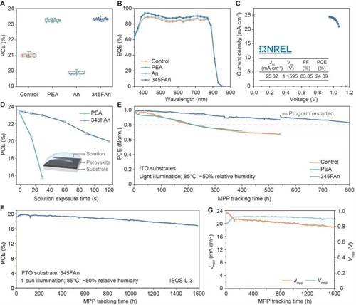 為了可以解決PSC的穩(wěn)定性,瑞士洛桑聯(lián)邦理工學(xué)院與其他的大學(xué)團(tuán)隊(duì)合作,利用氟化苯胺將PSC的效率提升至24.09%。在85℃的條件下實(shí)現(xiàn)PSC光照下1560小時(shí)的連續(xù)穩(wěn)定性,效率衰減只有15%。