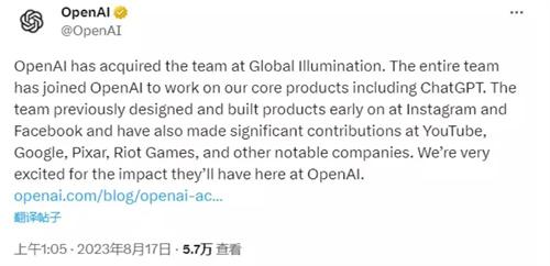 在北京時間2023年8月17日凌晨,美國知名科技公司openai在官網(wǎng)中發(fā)布公告,表示將會收購初創(chuàng)企業(yè)Global Illumination,并且會將該企業(yè)中所有的團(tuán)隊(duì)員工全部納入到openai公司中,現(xiàn)在Global Illumination團(tuán)隊(duì)成員已經(jīng)加入到了openai公司旗下ChatGPT的核心產(chǎn)品研發(fā)。