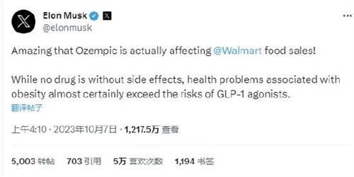 當(dāng)?shù)貢r(shí)間本周周五,馬斯克再次力挺減肥神藥,認(rèn)為肥胖造成的健康隱患會(huì)超過減肥藥物帶來的風(fēng)險(xiǎn)。馬斯克在自家的社交平臺(tái)上發(fā)文表示:“想不到減肥藥Ozempic真的影響了沃爾瑪?shù)氖称蜂N售。雖然沒有一種藥是沒有副作用的,但是肥胖相關(guān)的健康隱患幾乎肯定是超過GLP-1受體激動(dòng)劑的風(fēng)險(xiǎn)的。”