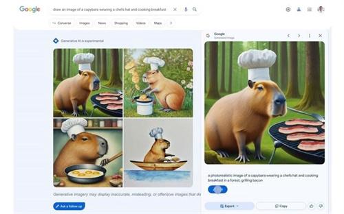 谷歌宣布從本周四開始,自家的“搜索生成體驗”將允許用戶根據(jù)文本提示直接創(chuàng)建圖片。比如用戶在使用的過程中想為一位喜歡噴人且喜歡動物是水豚的朋友制作卡片,用戶就可以直接搜索“畫一張帶著廚師帽和烹飪早餐的水豚的圖片”。在給出的結(jié)果當(dāng)中,最多可以生成4個不同的圖像。用戶可以根據(jù)這一結(jié)果再一次對各種細(xì)節(jié)進行編輯和描述,最終能夠獲得自己心目當(dāng)中最完美的圖像。