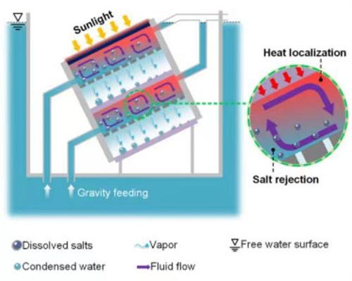 上海交通大學教授徐震原和合作者,提出一種基于漂浮連通器的受限水層蒸發器設計方案,并通過調控溫度、鹽度梯度獲得毫米級的溫鹽對流現象,形成很小的漩渦。在微小尺度溫鹽對流的幫助下,科學家提出這種溫鹽對流強化的多級太陽能蒸餾技術,解決太陽能蒸餾裝置,在提升能效和壽命之間的矛盾,在不同濃度下均實現被動式太陽能蒸餾效率突破,甚至可以實現20%濃縮海水的長時間穩定淡化。