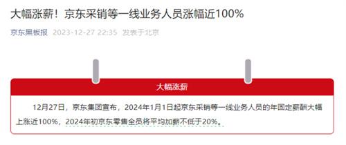 在北京時間2023年12月27日晚上,京東集團官方宣布從2024年1月1日開始,京東集團旗下的采銷等多個一線業務員工的年固定薪酬上漲,幅度將近100%。從2024年年初開始,京東集團旗下的零售員工平均加薪幅度不能夠低于20%。
