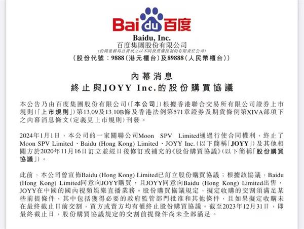 百度在港交所發(fā)布公告稱,2024年1月1日,本公司的一家關(guān)聯(lián)公司Moon SPV Limited通過(guò)行使合同權(quán)利,終止該公司、百度與歡聚集團(tuán)以及其他相關(guān)方于2020年11月16日訂立,并經(jīng)日后修訂或補(bǔ)充的《股份購(gòu)買(mǎi)協(xié)議》。