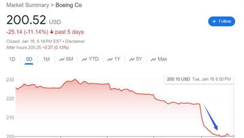 在機艙門事件發生以后逐漸發酵,1月16日當天,波音公司的股票價格下跌了7.9%,最終報價為每股200.51美元,總市值為1,213億美元,相當于在一夜之間蒸發了104億美元。根據美聯社報道,在當地時間1月15日,美國聯邦航空管理局表示,日本全日空航空公司旗下的一架波音系列飛機,于1月14日晚上在美國芝加哥奧黑爾國際機場滑行時,撞到了美國達美航空公司旗下的另一架波音系列飛機。