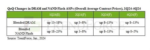 TrendForce研究數據顯示2024年第一季度已經成為增長季,DRAM合約價格當季的增長幅度大約是13%~18%。NAND Flash當季的增長幅度大約是18%~23%。