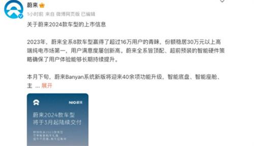 據了解,在2024年1月份,蔚來汽車的第2代車型用戶已經進行了Banyan系統新版本升級,一共涉及到40多項功能,包括主動安全、智能座艙、智能底盤等等。根據數據顯示,2023年年內,蔚來汽車旗下8款車型的總銷量達到了16萬輛,位于30萬元以上高端純電市場排行榜的第1名。