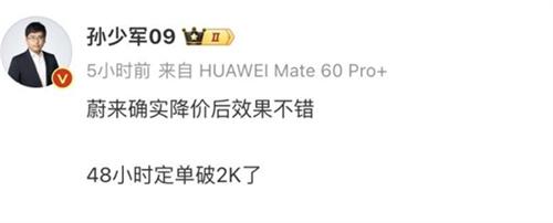 根據汽車媒體孫少軍透露,在短期優惠政策正式公布以后的48小時之內,蔚來汽車的訂單量突破了2000單。業內人士認為,本次短期優惠政策對于有購車需求的用戶來說非常具有吸引力。除了蔚來汽車以外,特斯拉、奔馳、寶馬等多個品牌都在一直調整價格,2023年年內,有部分車型的價格調整幅度超過了10萬元。與此作為對比,蔚來汽車旗下的產品策略一直以來都比較穩定,很少會出現優惠。
