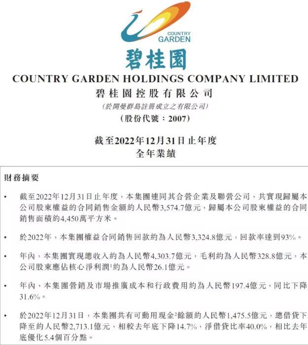 根據年報數據,碧桂園全年實現了約3574.7億元的權益合同銷售額,銷售面積約4450萬平方米,全年總去化率達到65%。此外,該公司權益回款金額約為3324.8億元,權益銷售回款率達到93%,連續7年達到90%以上。從核心盈利指標來看,碧桂園在報告期內實現了4303.7億元的營業收入,毛利和股東應占核心凈利潤分別為328.8億元和26.1億元。