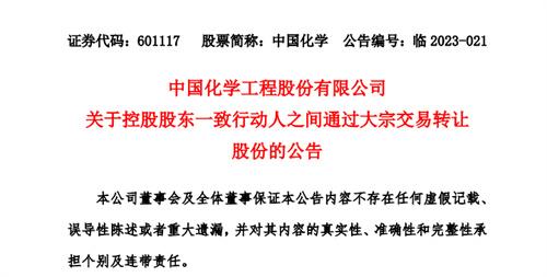 參與此次交易的上市公司披露出已經在13日就收到中國化學建設投資集團有限公司的通知,會用大宗交易的方式轉讓公司的股價,股份為2.47%,交轉給中國化學工程集團有限公司旗下的國化投資控股有限公司。中國化學發出聲明,此次交易屬于公司大股東內部持股變化的交易。