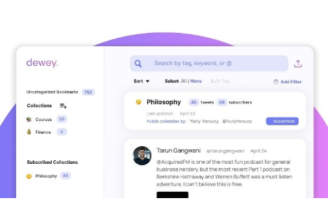 因此,為了幫助您管理已添加書簽的推文,Dewey 會抓取您隨時間添加書簽的所有推文,并將它們放入自己的集合中,以便您使用標簽輕松組織它們、使用關鍵字搜索特定推文,并將已添加書簽的推文導出到其他寫作或筆記應用程序。