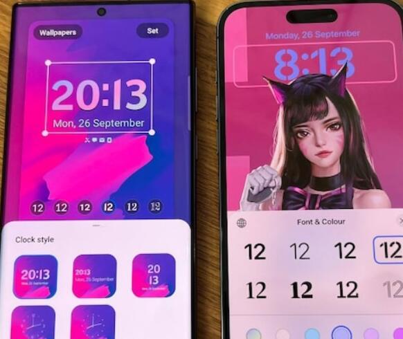 在這里,三星用戶可以從五種不同的時鐘樣式中進行選擇,而iOS 16上提供了八種。還可以選擇更改時鐘顏色和字體樣式。同樣,在選擇壁紙時,兩個系統都提供了具有相似布局的背景的“集合”。