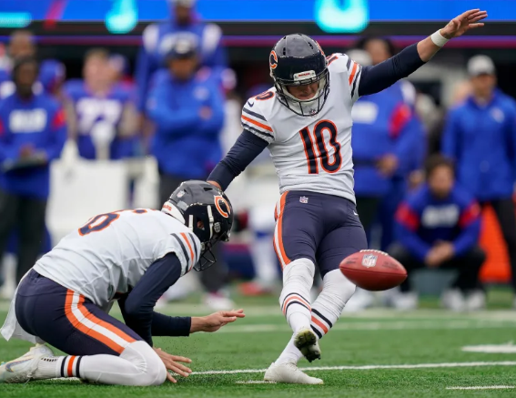 周日,在熊隊以 20-12 輸給休斯頓德州人隊的比賽中,巴德格利得到了芝加哥的每一分。他作為踢球手開羅桑托斯的替補,后者因個人原因缺席了比賽。 2022 年 10 月 2 日星期日,在新澤西州東盧瑟福舉行的 NFL 橄欖球比賽的第一節,芝加哥熊隊踢球手邁克爾·巴格利(10 歲)在對陣紐約巨人隊的比賽中射門得分(美聯社照片/約翰·明奇略)