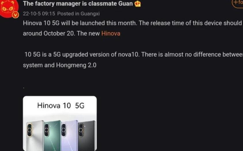 據廣受歡迎的消息商工廠廠長石冠(機器翻譯)稱,華為將于10月20日在中國推出。該手機據說是今年早些時候推出的Nova 10的5G升級。據稱的手機將具有類似于Nova 10的規格,情報員說。