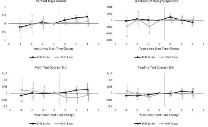 Bastian和Fuller的一項研究范圍廣泛,涵蓋了2011-12年至2016-17年間北卡羅來納州的所有公立非特許小學,其中一項研究的重點是北卡羅來納州的一個城市地區(qū),該學區(qū)在2016-17年改變了其小學和高中的開學時間。在每項研究中,作者都研究了開始時間與學生缺勤和停課以及標準化考試成績之間的關系。