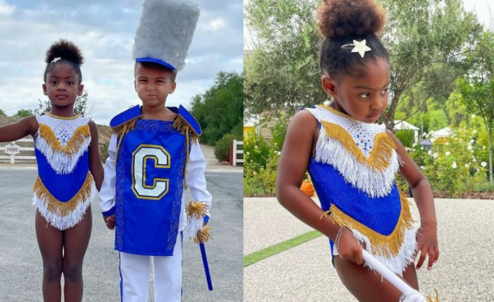可以看到三歲的 Kaavia 和她最好的朋友 Crosby Sparrow 模仿跳舞娃娃和鼓少校,搭配皇家藍色、白色和金色的合奏。