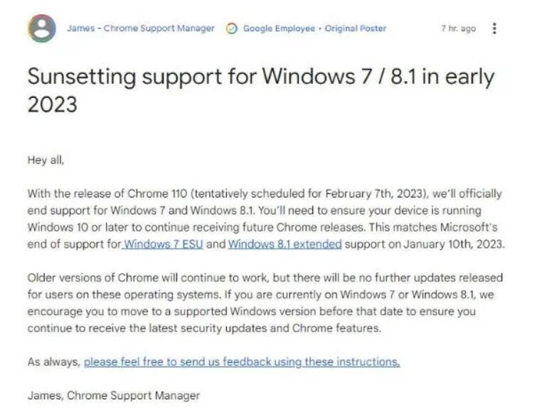 正如谷歌發(fā)言人指出的那樣,隨著chrome 110計劃于2023年2月7日發(fā)布,對上述微軟桌面操作系統(tǒng)版本的官方支持將結束。上述決定是在谷歌自己的溝通渠道上宣布的。