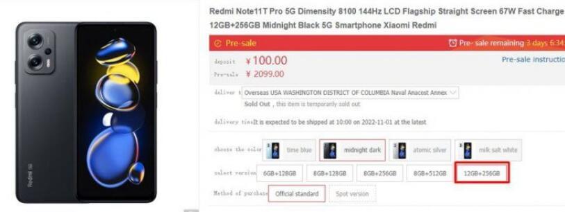 Note 11T Pro的6 GB內存+ 128 GB存儲,8 GB RAM + 128 GB存儲和8 GB RAM + 256 GB等變體的售價分別為1,599元人民幣(約221美元),1,799元人民幣(約249美元)和1,999元人民幣(約277美元)。總的來說,Note 11T Pro在中國有五種型號!買家可以使用紅米Note 11T Pro,顏色有午夜深色,原子銀,乳鹽白和原子銀等顏色。