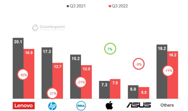 根據(jù)Counterpoint 的一份報(bào)告,出貨量在 2021 年第三季度至 2022 年第三季度之間出現(xiàn)了兩位數(shù)的下降。包括聯(lián)想、惠普、戴爾和華碩在內(nèi)的大多數(shù)頂級(jí) PC 制造商的出貨量都出現(xiàn)了下滑……盡管蘋果實(shí)際上出現(xiàn)了增長(zhǎng),這可能是由于公司決定在第二季度末推出新車型。