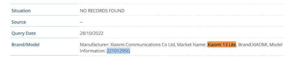 根據(jù)Pricebaba的報告,小米13 Lite已出現(xiàn)在IMEI數(shù)據(jù)庫中,型號為2210129SG。型號末尾的“G”表示該設(shè)備將面向全球市場。此外,該報告聲稱小米13 Lite將作為小米Civi 2的更名版本首次亮相。