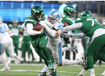 2022 年 12 月 18 日,在新澤西州東盧瑟福的大都會人壽體育場,紐約噴氣機隊四分衛扎克威爾遜在下半場被底特律雄獅隊后衛羅密歐奧克瓦拉解雇。