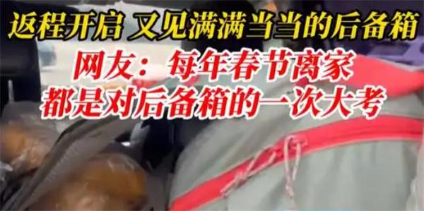 很多人都紛紛拍攝了臨醒之前拔充電器的視頻,網(wǎng)友們表示過年回家的人都知道,拔下充電器,再見就是新的一年,不僅有拍攝拔出電器的視頻,更多的都是在返程臨行前,不管是后備箱還是行李箱中,都被塞得滿當(dāng)當(dāng)?shù)模芏嗑W(wǎng)友都表示每年春節(jié)假期過完離家的時候,自己的后備箱和行李箱中都被父母塞滿了喜歡吃的東西,盡管覺得太多,已經(jīng)塞不下了,但是父母仍然說太少了,這么點(diǎn)東西都拿不了?