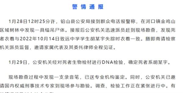 在1月28日,江西警方發布了一則通報,在通報中表示林中發現了一句易掉尸體,經過DNA檢驗確定死者系胡鑫宇,在28日上午12點左右,鉛山縣公安局接到群眾的報警電話稱河口鎮金雞山區域的梳理中發現了一具縊吊尸體,接到報警電話第一時間,當地公安機關立即指派警員趕往現場勘查,經過勘察發現現場死者的衣著與當時,在2022年10月14日胡鑫宇失蹤時的衣著一致。