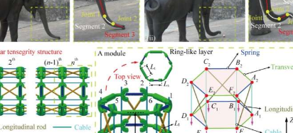 由Wu和他的同事創造的象鼻啟發機器人基于3級張拉整體結構,該結構由多個彈性元件組成,這些彈性元件均勻分布在整個結構中。這使研究人員能夠簡單地通過用具有不同剛度大小的其他彈性元件替換彈性元件來對機器人的局部剛度特性進行編程。