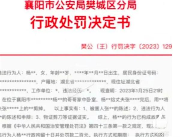 前幾日一名來(lái)自湖北襄陽(yáng)的女子,因剪掉其丈夫的下體被處以行政拘留10日并罰款200,對(duì)于這個(gè)處罰,引發(fā)了眾網(wǎng)友的強(qiáng)烈質(zhì)疑,在1月26日,湖北公安執(zhí)法部門(mén)在公安平臺(tái)上發(fā)布了一則關(guān)于行政處罰的決定書(shū)在處罰書(shū)中顯示,涉事女子為楊某,在1月25日晚上9點(diǎn)多的時(shí)候,楊某使用剪刀將其丈夫張某生殖器上的陰莖剪了下來(lái),當(dāng)時(shí)張某在襄陽(yáng)市楊某哥哥的臥室中。