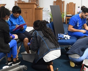在外科學系教員 Linda M. Harris(外科學教授兼血管外科項目主任)和 Brittany C. Montross(臨床助理教授)的監督下工作的學生提供了身體檢查和足部護理。