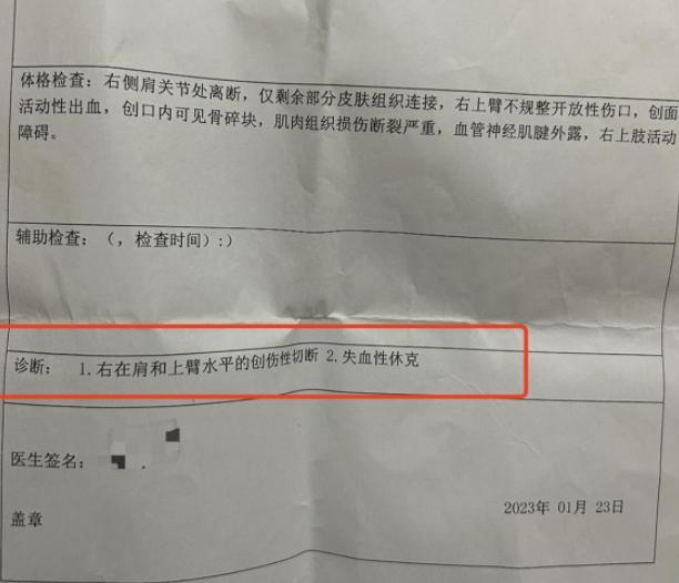 孩子被送往醫(yī)院以后因又被受傷過于嚴(yán)重,最終只能截肢,根據(jù)1月23日上饒市人民醫(yī)院出具的診斷證明中顯示,當(dāng)時翁源的右側(cè)肩關(guān)節(jié)處離斷,僅剩部分皮膚組織連接,右上臂不規(guī)則開放性傷口創(chuàng)面有活動性出血,那件骨碎塊,血管,神經(jīng),肌腱,露出肌肉組織嚴(yán)重?fù)p傷。