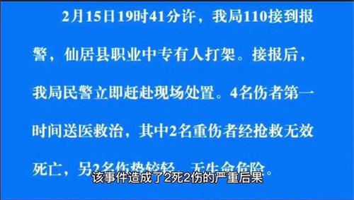 浙江省仙居職業(yè)中專打架斗毆事件,到目前為止導致兩死兩傷,警方已經(jīng)開始立案調(diào)查。視據(jù)知情人士透露事發(fā)當天有兩名社會閑散人員通過翻墻進入學校,另外其他的閑散人員是從校門直接進入學校,毆打校內(nèi)學生。浙江省仙居縣公安局于2月16日發(fā)布警情通報,成仙居縣職業(yè)中專于2月15日19:00有人打架,導致4人受傷,4名傷者被送到醫(yī)院后,兩人由于重傷不治身亡,另外兩名傷者傷勢比較輕,暫無生命危險。