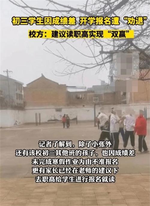 相關記者了解到,這一情況并不是小張一個學生所遇到的問題,該校初三年級其他班也有孩子出現了由于成績差,不讓報名的情況,甚至有些家長在老師的建議下到高職學校給孩子報名就讀。學校的相關負責人像了解情況的相關記者解釋稱由于這些孩子的學習成績很差,想要考上高中非常困難,目前職中現在正在進行春季招,校方僅僅是給孩子們提供建議,讓孩子們能夠有一項多的選擇,孩子們選擇去讀職中,能夠更好的實現雙贏,當然并不會強迫孩子們去上高職,不會禁止孩子們參加中考。