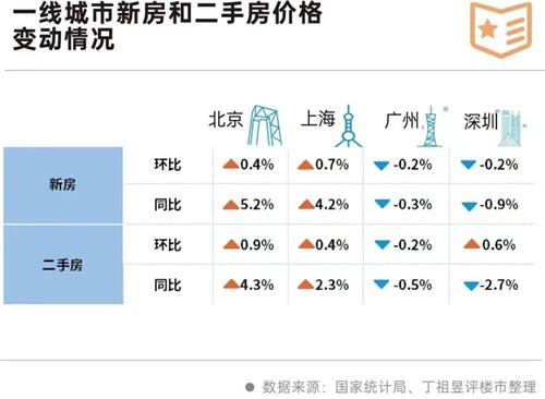 一線城市新房價(jià)格上漲0.5%,北京上漲0.6%,上海上漲0.5%,廣州上漲0.6%,深圳上漲0.4%。一線城市的二手房上漲為0.5%,北京上漲0.7%,上海上漲0.9%,廣州上海0.6%,深圳下降0.2%。從漲幅分析得出北京和廣州位于并列第3位,上海位于第4位,深圳位于第5位。