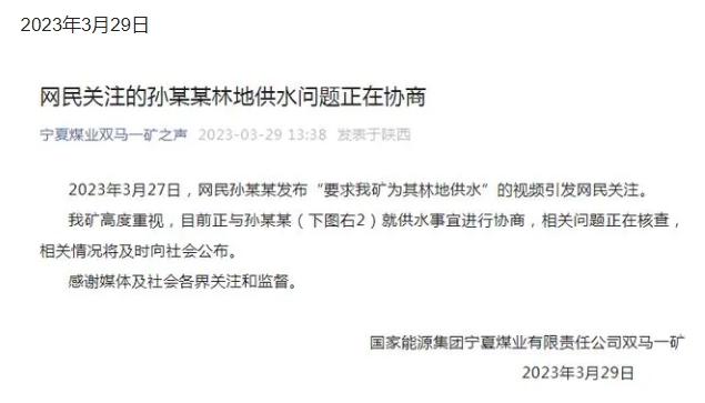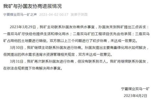 3月31日,寧夏煤業雙馬一礦再次聯系孫國友進行協商,但未能聯系到本人。該礦將繼續與孫國友聯系,依法合規地協商解決用水事宜。