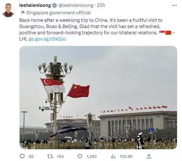 在社交媒體的發文中,李顯龍寫道:“結束了為期一周的訪華之行,已經回到家中。此次訪問廣州、博鰲和北京收獲頗豐。很高興這次訪問為新中兩國的雙邊關系開辟了一條嶄新的、積極的、具有前瞻性的發展道路。”
