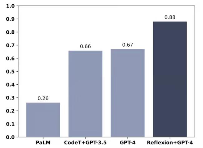 在研究團隊使用這種技術對GPT-4進行的幾種不同性能測試中,GPT-4在解決從未見過的Python編程問題的HumanEval測試中,原本準確率為67%,使用反思技術后,準確率提升至88%。在Alfworld測試中,GPT-4的準確率從73%提高至97%。在HotPotQA測試中,GPT-4準確率從34%提高至54%。