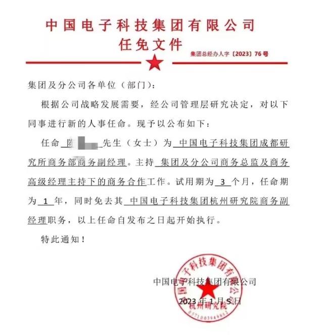 但是,記者從中國電科成都多家單位獲悉,這些信息都是虛假的。集團公司已經開展了多輪次排查,包括勞務派遣和協作人員,均未找到該陳某人。此外,網上出現的任免文件明顯是偽造的。相關單位已報案。