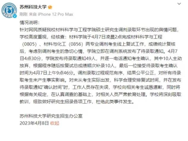 蘇州科技大學(xué)在聲明中表示,學(xué)校工作人員存在失誤,對(duì)未從考生實(shí)際出發(fā),科學(xué)合理安排復(fù)試時(shí)間和發(fā)布待錄取通知“確認(rèn)時(shí)間”的問(wèn)題深感抱歉。學(xué)校將嚴(yán)肅教育處理相關(guān)人員,并認(rèn)為具體責(zé)任應(yīng)由“相關(guān)人員”承擔(dān)。然而,網(wǎng)民們對(duì)此事仍有所不滿,認(rèn)為學(xué)校應(yīng)更加關(guān)注考生的利益和命運(yùn)。