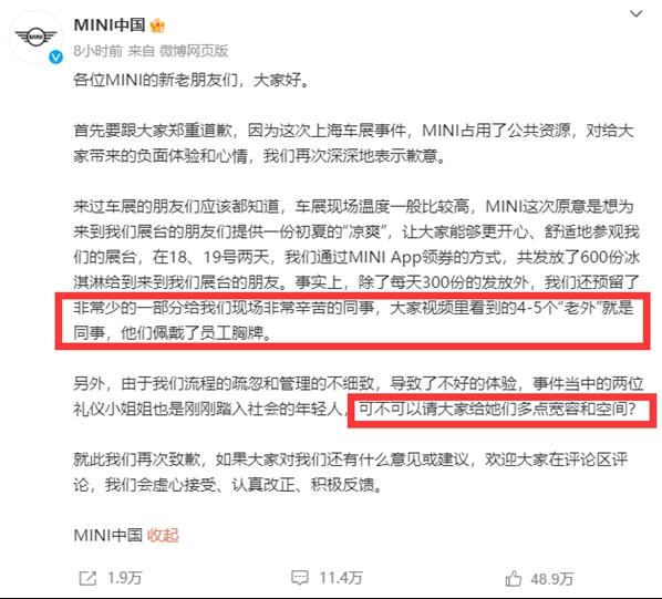 其次,寶馬MINI方面連發兩條道歉聲明,但遭到了網友的質疑。第一篇道歉聲明簡短而粗糙,被網友吐槽不如ChatGPT寫得好。第二篇道歉聲明則在解釋“老外”是同事的時候,沒有提及之前的錯誤。這種不夠真誠和坦率的態度,難以消除網友的不滿和懷疑,也會進一步傷害寶馬MINI的品牌形象。