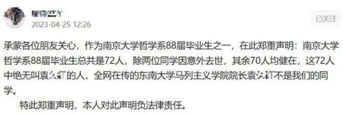 近日,東南大學馬克思主義學院院長袁某某因在工作群里發色情照被免去職務。而在這起事件引起廣泛關注的同時,又有網友質疑袁某某的學歷是否存在造假情況。據網友反映,袁某某聲稱自己是南京大學哲學系88屆畢業生,但是該年級總共只有70名同學,且不存在叫做袁某某的人。對此,東南大學紀委監察處工作人員表示已經關注到了這些信息并已上報。目前,具體情況仍需等待學校宣傳部的公布。