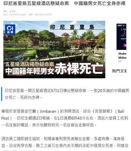 5月1日,在印尼巴厘島的洲際酒店發生一起令人驚恐的命案,兩名中國游客不幸身亡。這對年輕的20多歲的男女,住在該酒店4223房間,男性死者被發現躺在酒店走廊的露臺上,渾身是血,而女性死者則躺在房間浴室內,全身赤裸,頸上有纏繞的傷口。案件正在當地警方的調查中,目前還無法確定兩人是否被他殺或自殺。