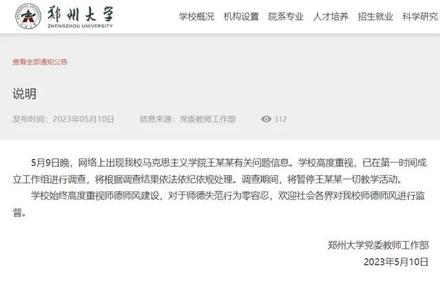 對于這一事件,鄭州大學黨委教師工作部表示高度重視,并迅速采取行動展開調查。他們承諾將根據調查結果依法依紀依規處理該教師。同時,在調查期間,該教師將被暫停一切教學活動,以確保調查的公正性和客觀性。