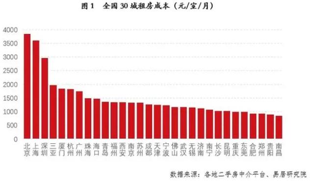 根據數據,北京、上海、深圳、三亞和廈門的房租最高,而東莞、合肥、鄭州、貴陽和南昌的房租最低。另外,報告還指出房租收入比最高的城市是北京、三亞、上海、深圳和???,而合肥、南昌、寧波、長沙和無錫的房租收入比較低。