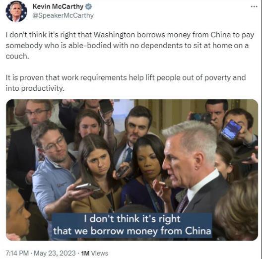 麥卡錫表示:“我們向中國借錢,讓那些不用照顧家人且身體健全的人坐在沙發上享福,我認為這是不對的。”他認為這個問題已成為打破債務上限談判僵局的核心問題,不能讓那些無所事事的美國人再拖累國家債務。